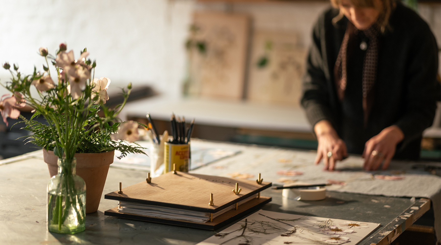 By late winter, the studio’s archive of pressed botanicals runs low and the heavy wooden presses sit empty on their shelves. Then come the first signs of change: winter blossom, snowdrops, hellebores pushing through cold soil. Soon after, daffodils and crocus make it official. The year has started.