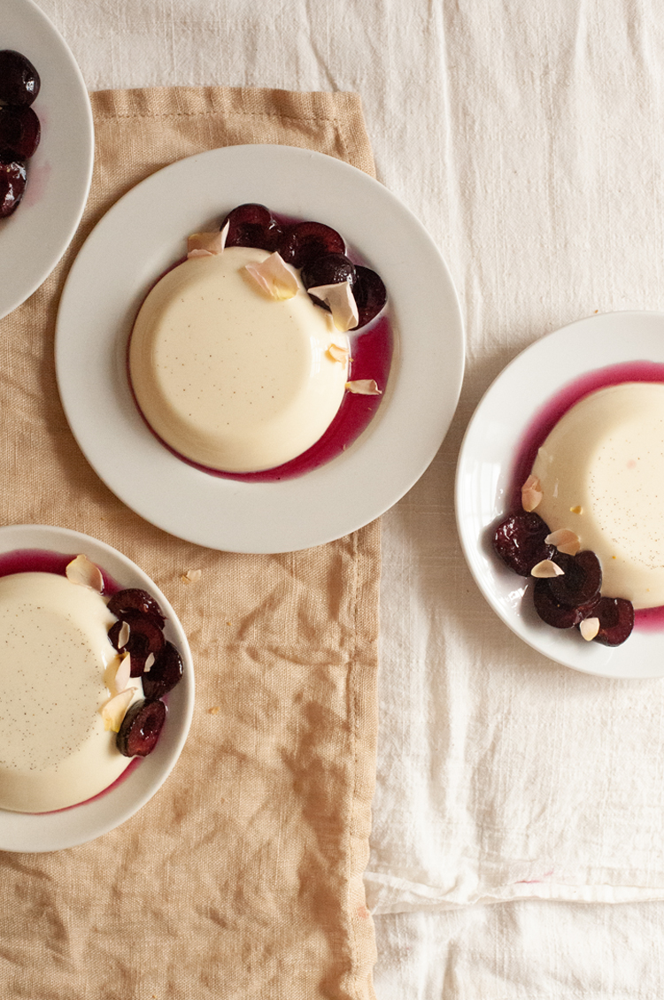 9. To serve, place the ramekin or pudding mould in a bowl of hot water for a few seconds to loosen the panna cotta. Place a serving plate on top then quickly flip the panna cotta over to release. Repeat for each serving and spoon some cherries and syrup around the outside of the panna cotta with a little scattering of rose petals to finish.